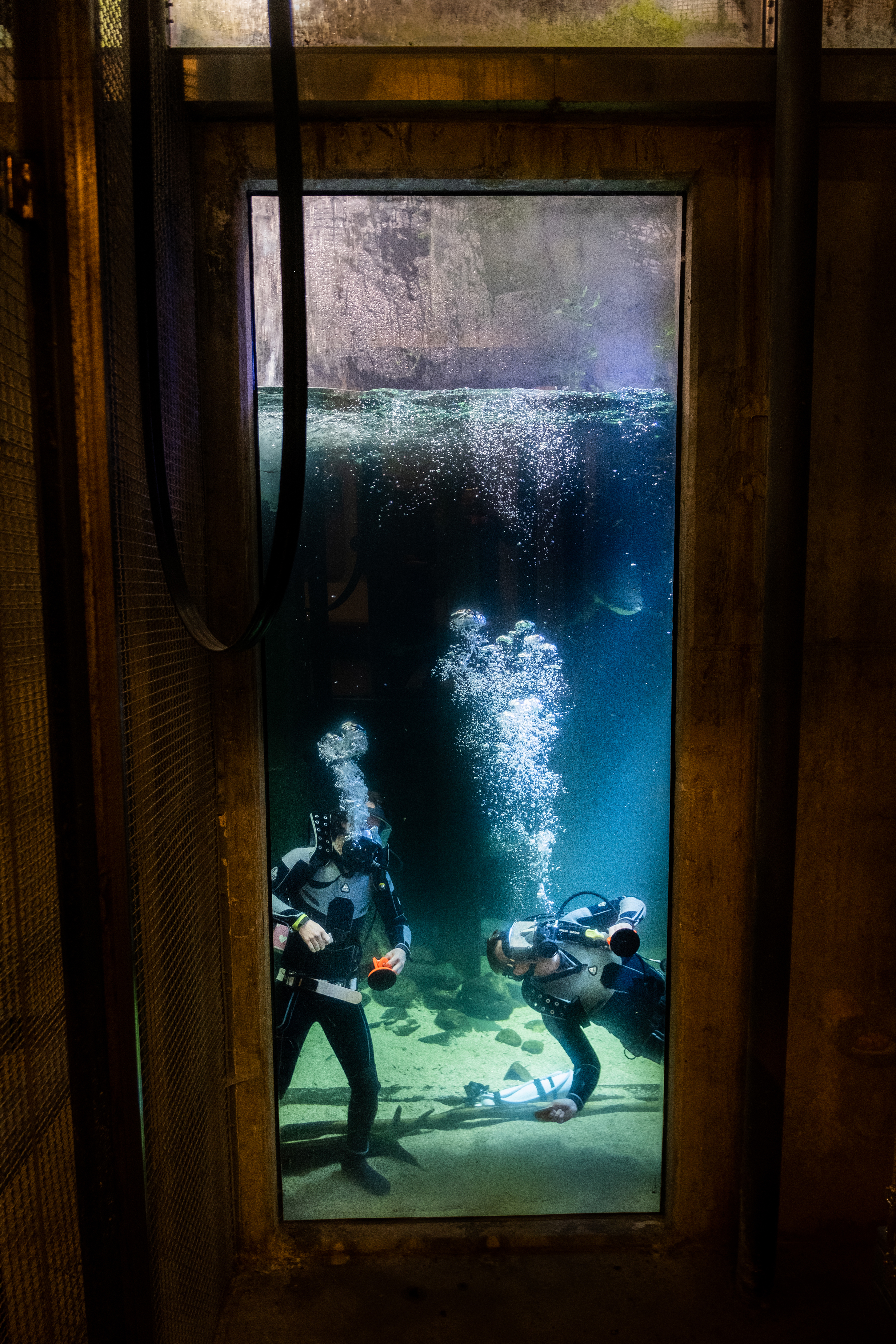 Erik Lindström och Karl Larsson, marinbiologer och yrkesdykare, rengör akvariet.