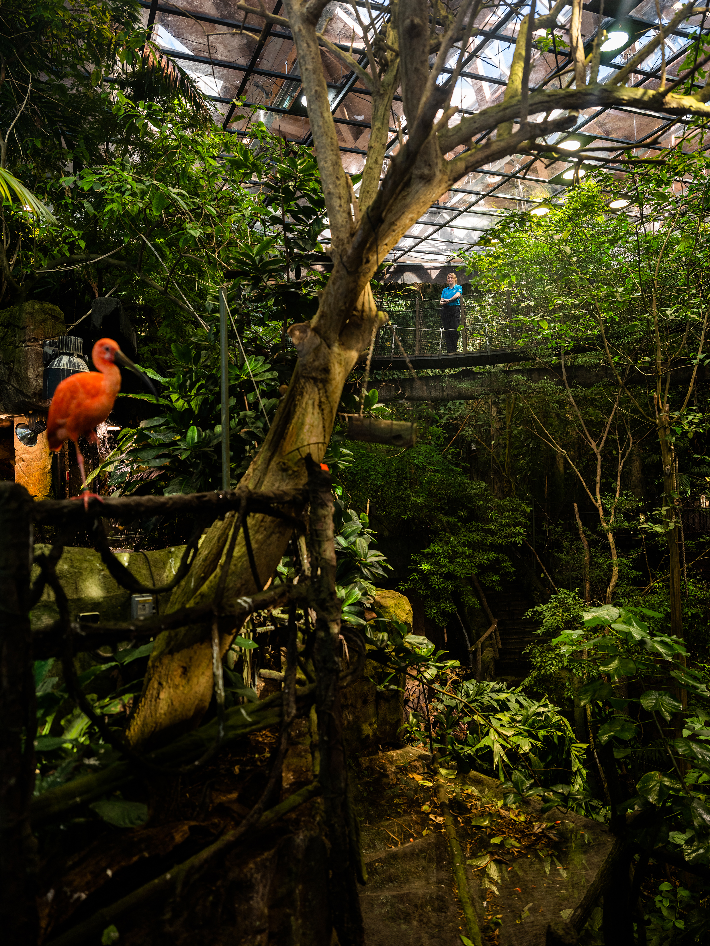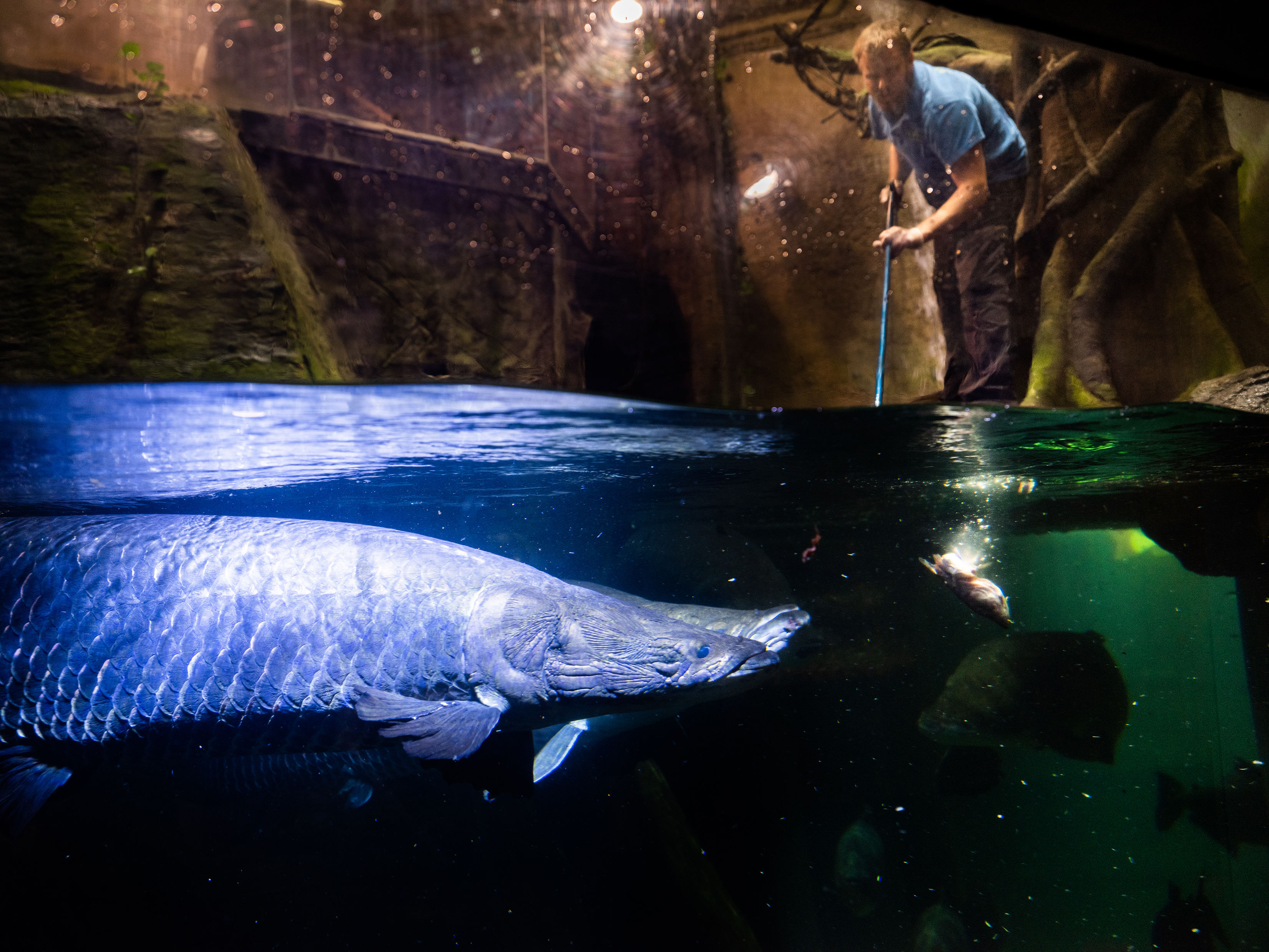 När Karl Larsson matar fiskarna börjar han med rödbukspirayorna på toppen av den 18 000 kubikmeter gröna regnskogskuben och följer vattnets väg, förbi en röd ibis-familj, färgglada grodor och två små krokodiler, för att avsluta med några av hans favoriter; de enorma Arapaima gigas och Tambaqui-fiskarna bredvid hisschaktet.