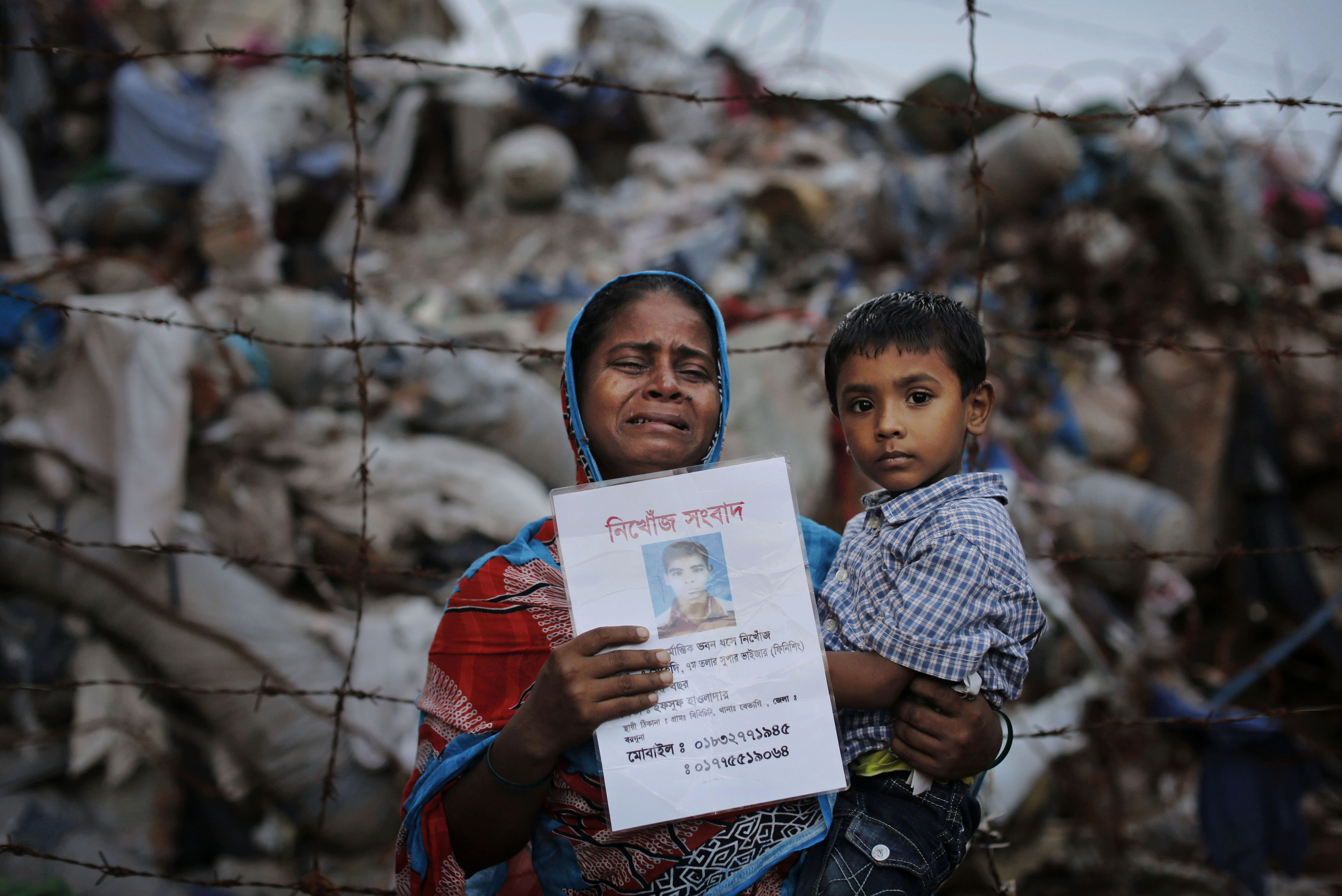 En kvinna söker efter sin son, som arbetade i textilfabriken Rana Plaza, efter fabriksraset i Bangladesh 2013.