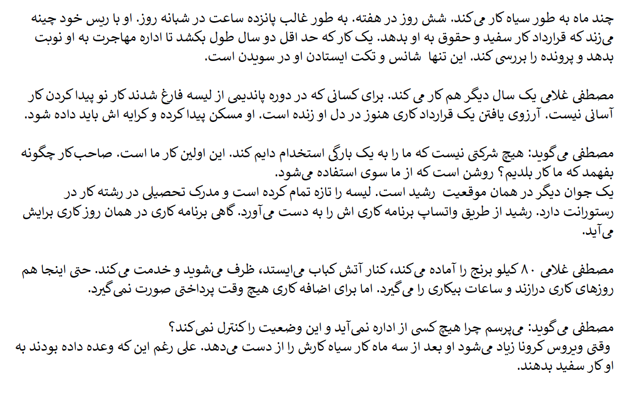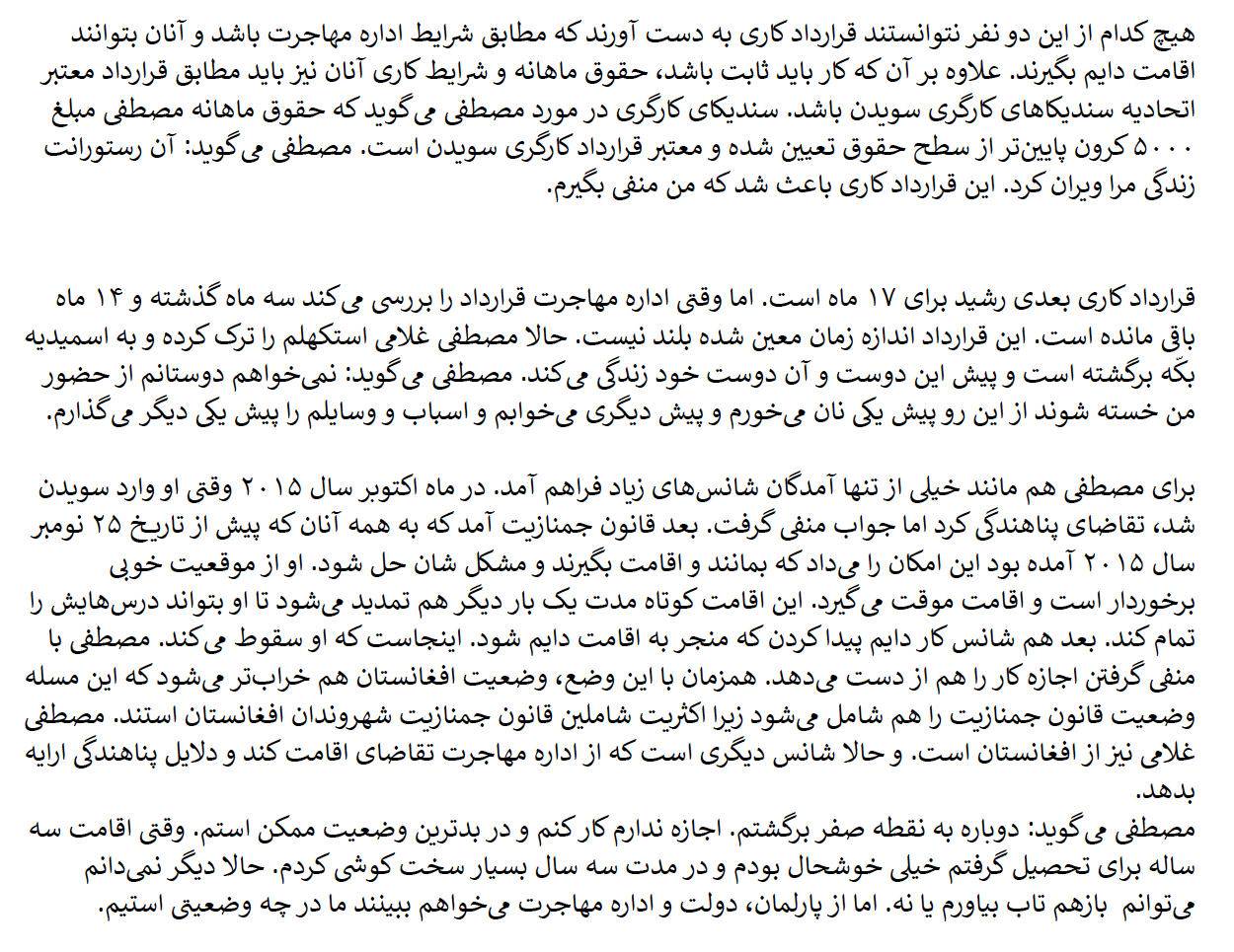 مصطفی غلامی بعد از هفت سال زندگی در سویدن، به نقطه صفر اولیه برگشته است. پس به اسمیدیه بکّه همانجا که از اول به آنجا آمده بود. دوباره به بیاقامتی و بی مدرکی برگشته است. مصطفی میگوید: « طاقتم تاق شده است و توان دیگر ندارم»
