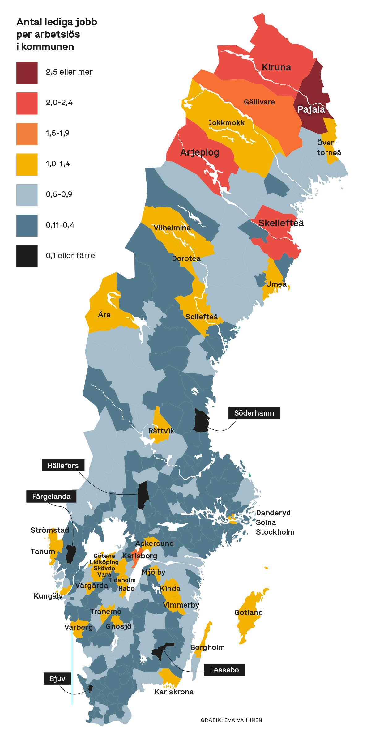 Där går det drygt 13 arbetssökande på varje utannonserat jobb. I Pajala i Norrbotten är det tvärtom brist på arbetslösa jämfört med antalet lediga jobb. Där finns det i stället 2,5 jobb per arbetssökande.