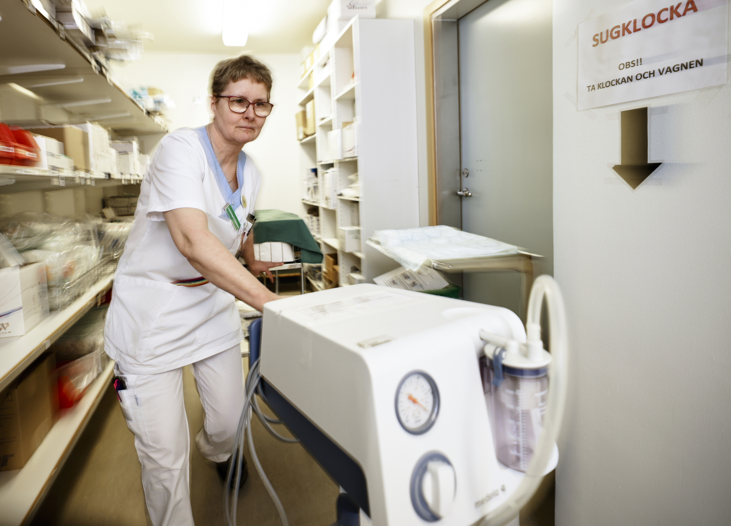 När sugklockan ska användas är det ofta akut inne i förlossningsrummet. Maria Johansson tränar att snabbt hämta och sätta igång apparaten som det sedan är undersköterskans uppgift att sköta tillsammans med en läkare.