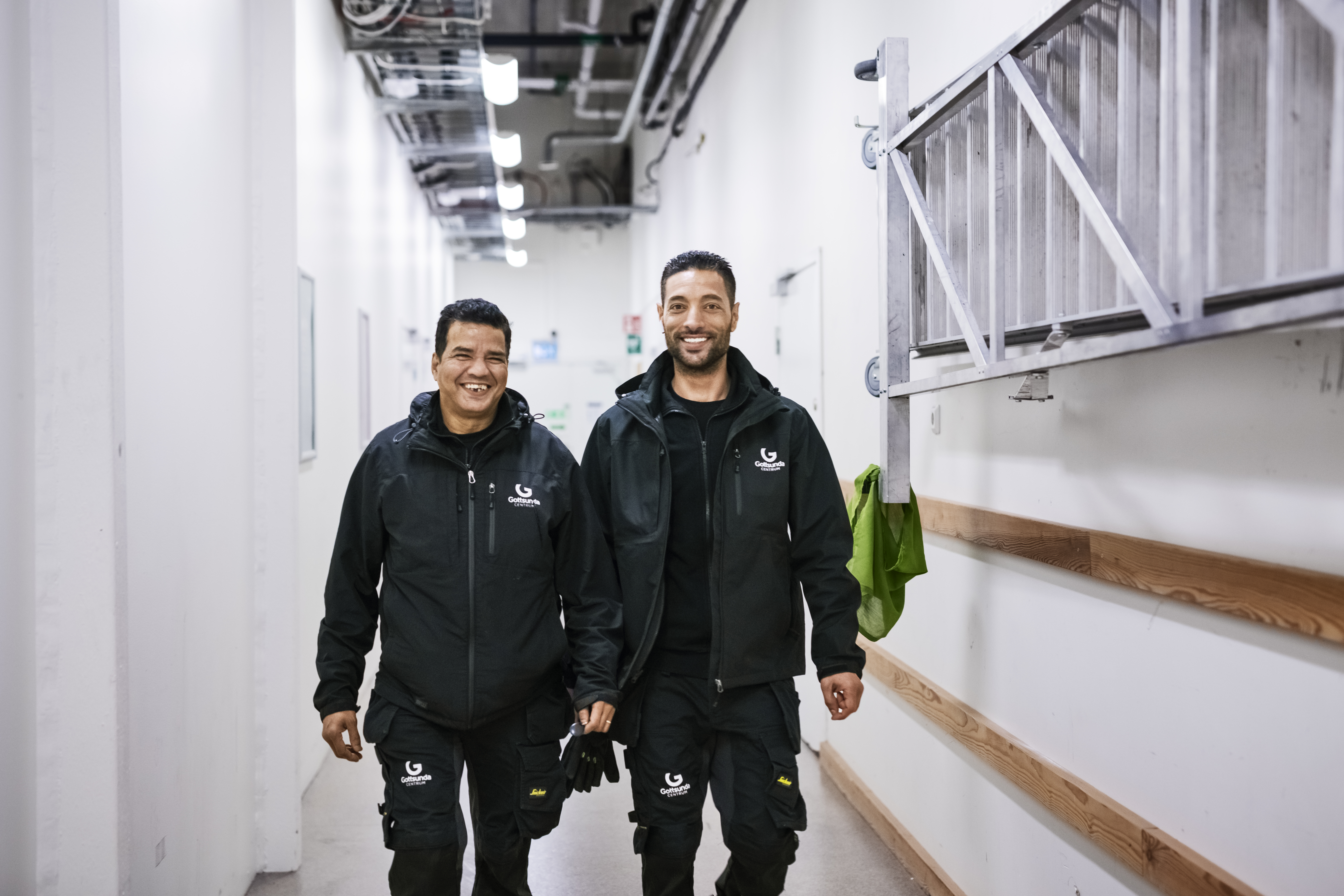 Fastighetsskötarna Shane Christopher Lee och Yahya Abdeen i Gottsunda centrum.