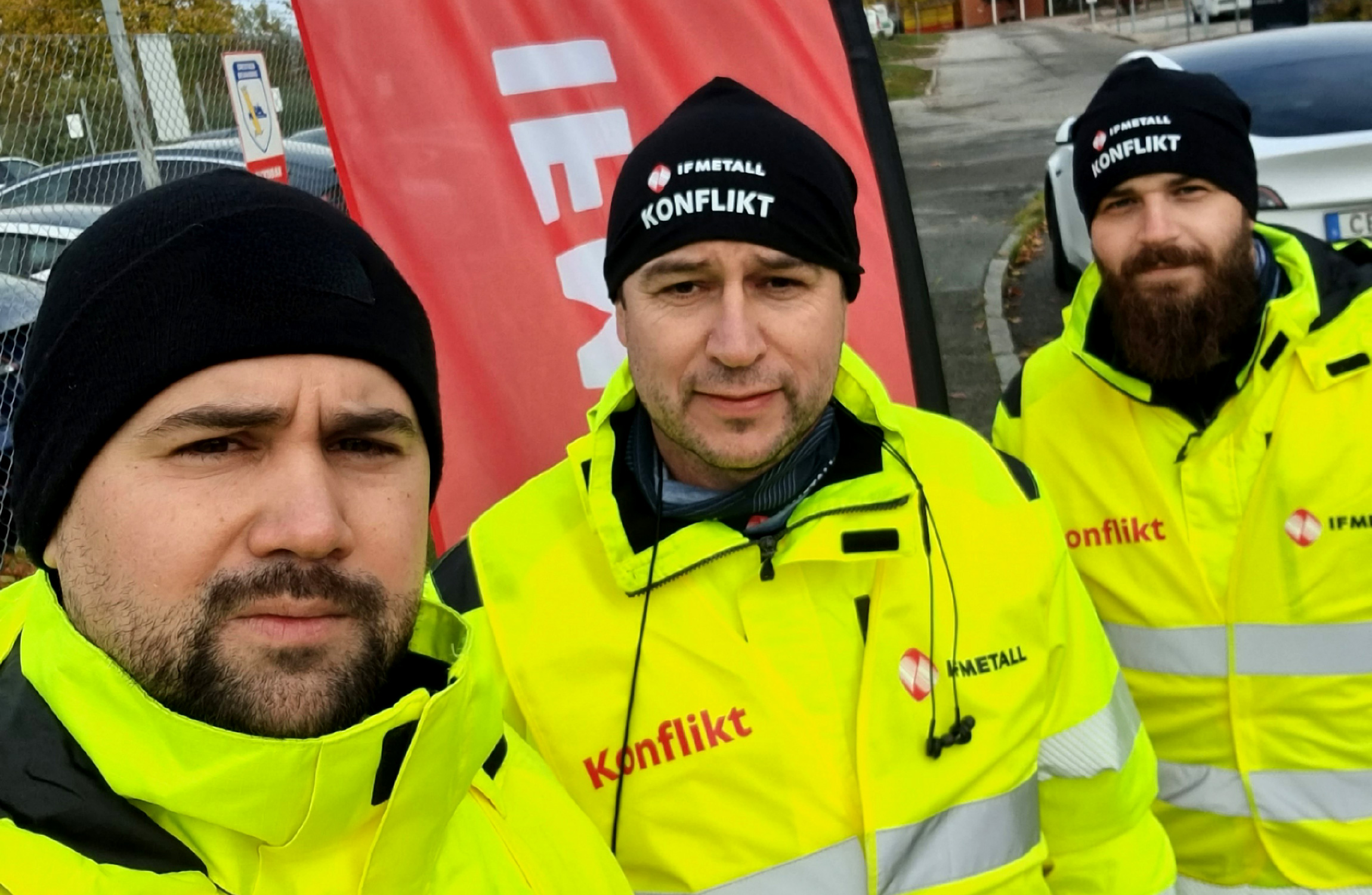 Tarik Dedic, Adis Heldic, och Isak Dudus från IF Metall står strejkvakt vid Tesla.