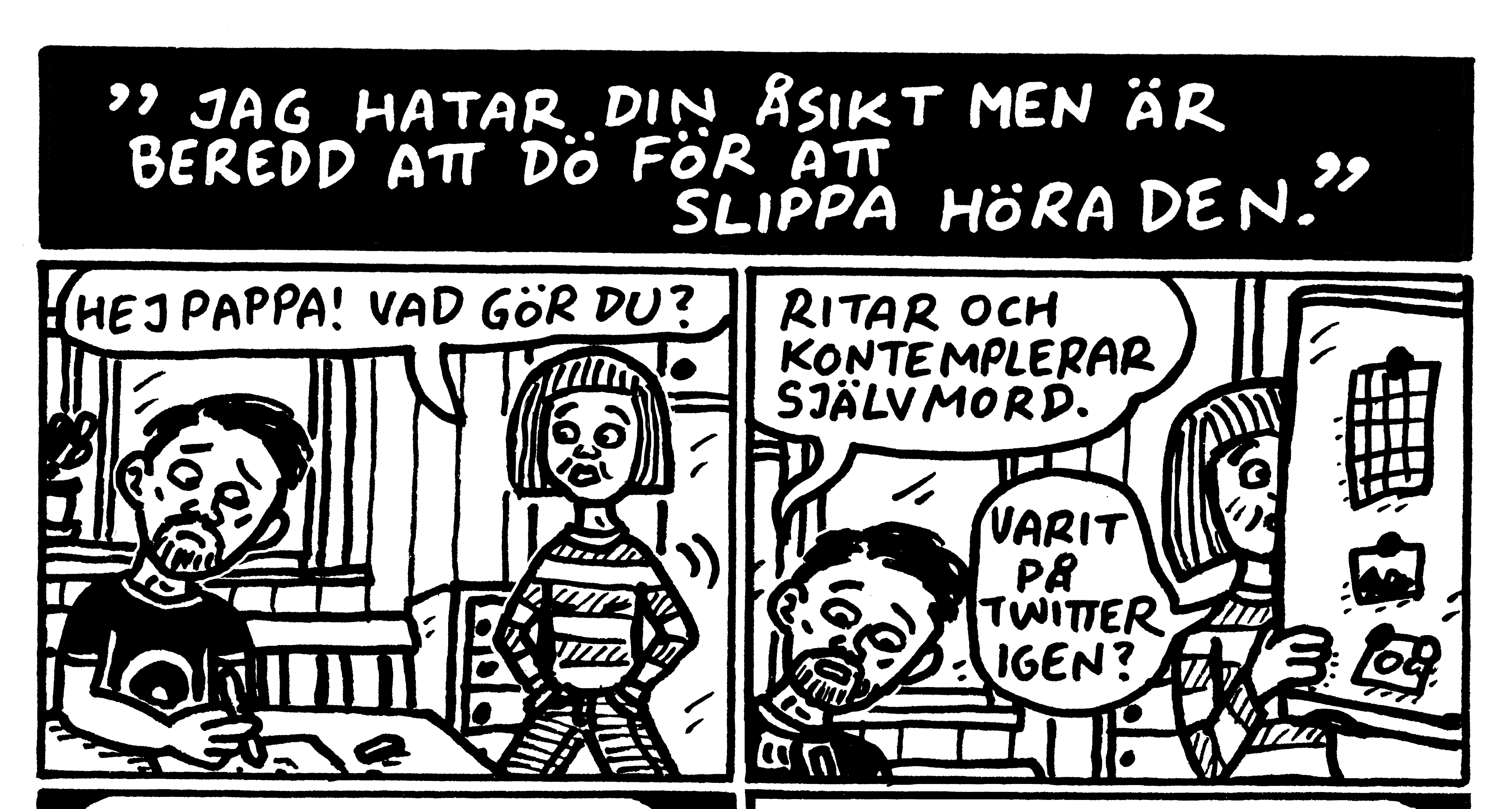– Jo, jag är väldigt nöjd med serien som avslöjar det absurda i Hanne Kjöllers argumentationsteknik. Hon hörde faktiskt av sig och ville köpa originalet, vilket jag väljer att tolka som att hon insåg att jag har rätt.