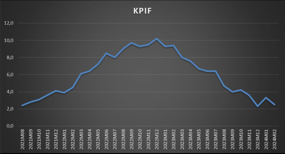 Efter den höga inflationschocken förra året har KPIF stadigt vandrat nedåt och ligger i dag i paritet med inflationsmålet.