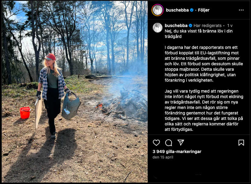 Men då kom Ebba Busch, energi- och vice statsminister, som en räddare i nöden. Hon satte fyr i sin trädgård och la upp på Instagram. Budskapet var glasklart: “Du ska visst få bränna löv i din trädgård”.