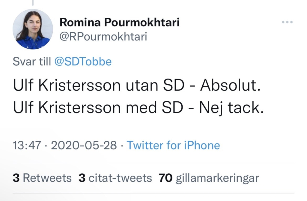 Romina Pourmokthari. Hallå, du lovade ju att avgå om du inte vände klimathaveriet?! Men ordet hölls inte angående SD-samarbete och visar sig vara vatten värt även här.