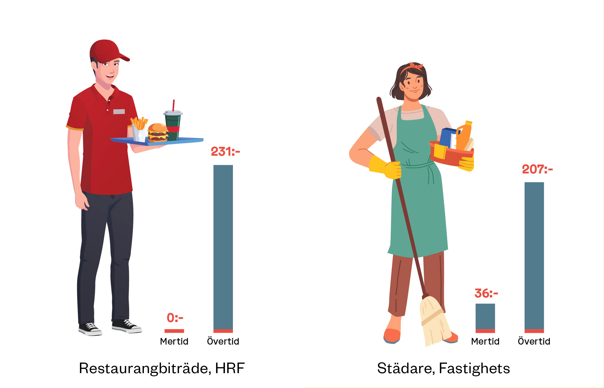 För personal i kommunal äldreomsorg är skillnaden ännu större. Och för deltidsanställda i hotell, restauranger och butiker ger mertid inte ett öre mer än den vanliga timlönen (se grafik ovanför).