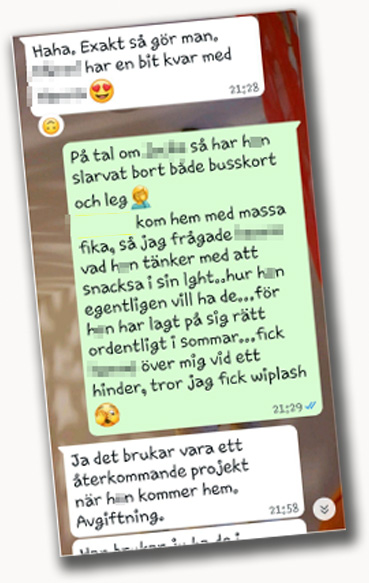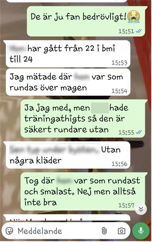 Chattarna avslöjar även att en boende blir utan “både beröm och lördagssnacks” när hen “smet iväg” och köpte en smoothie. I en annan chatt skriver personalen att en brukare “lagt på sig rejält under sommaren”.