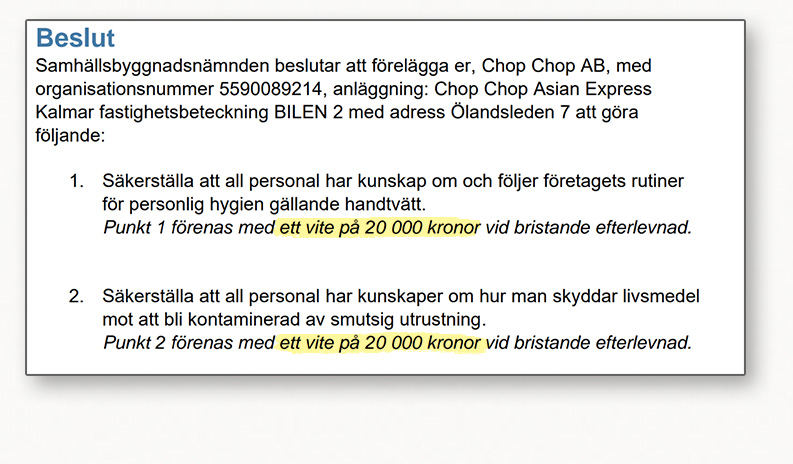 Beslut om vite till en av Chopchops restauranger.