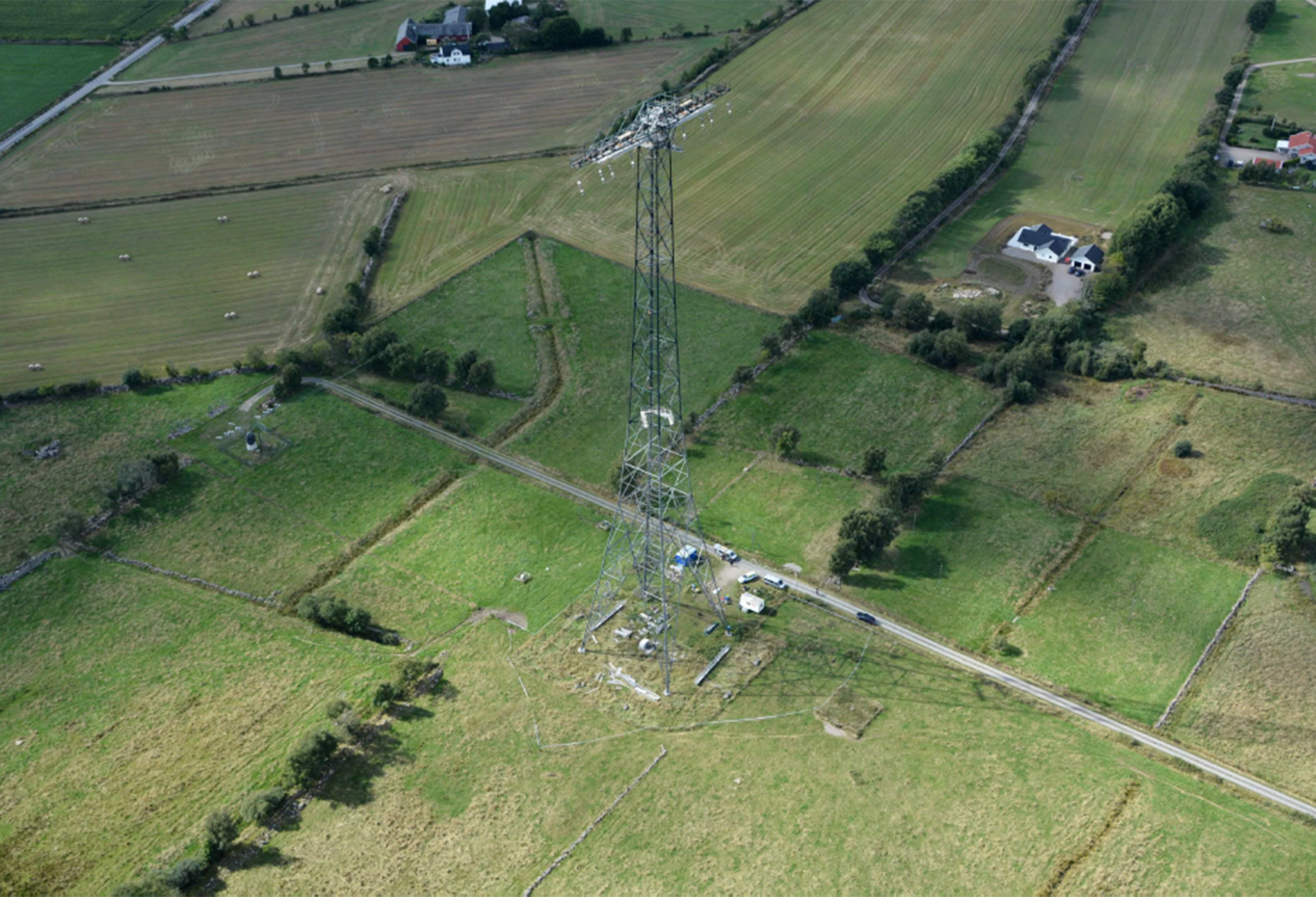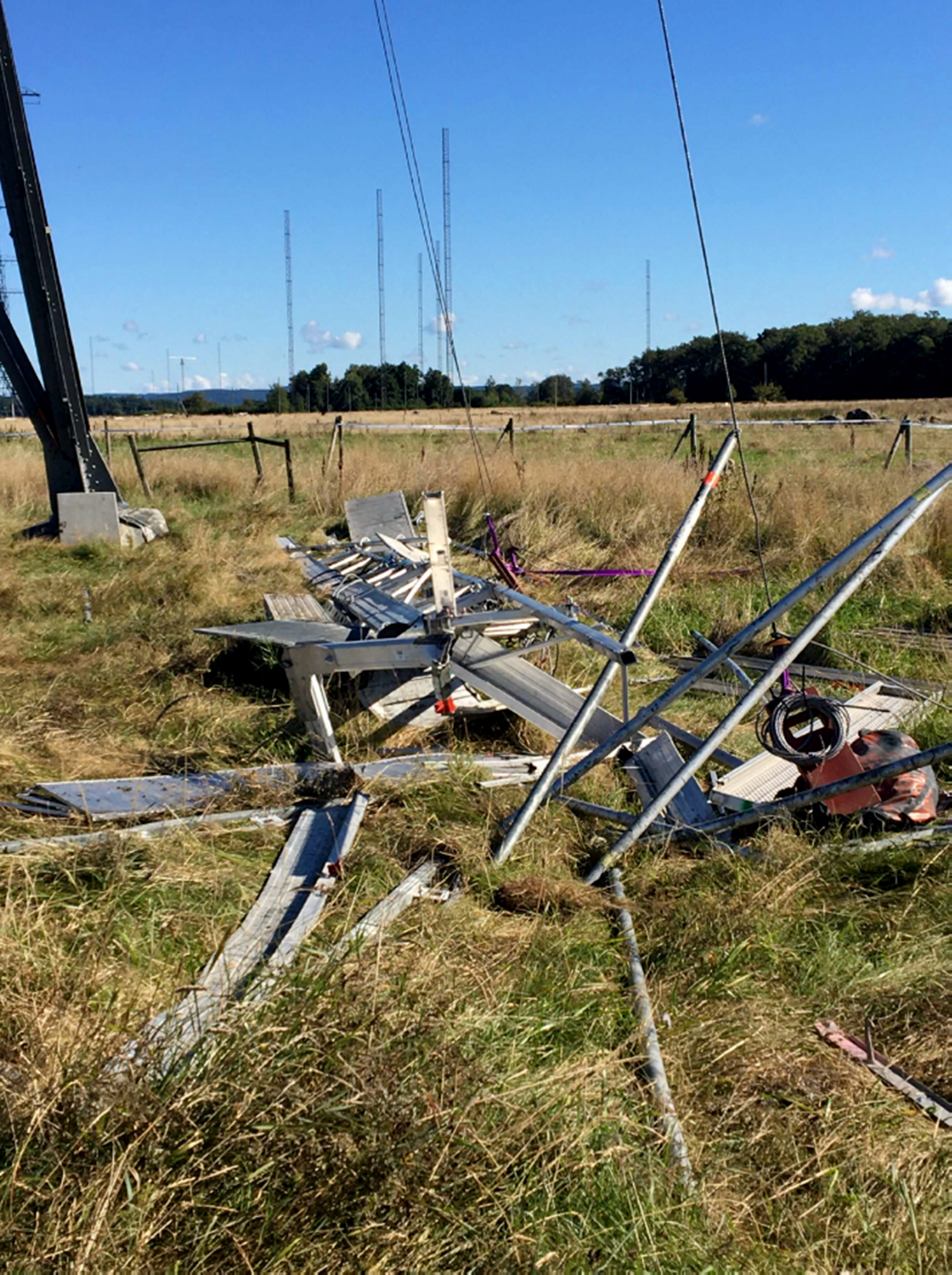 Mannen föll från ungefär 120 meters höjd i antenntornet, till höger syns arbetskorgen som lossnade och slogs sönder i fallet.