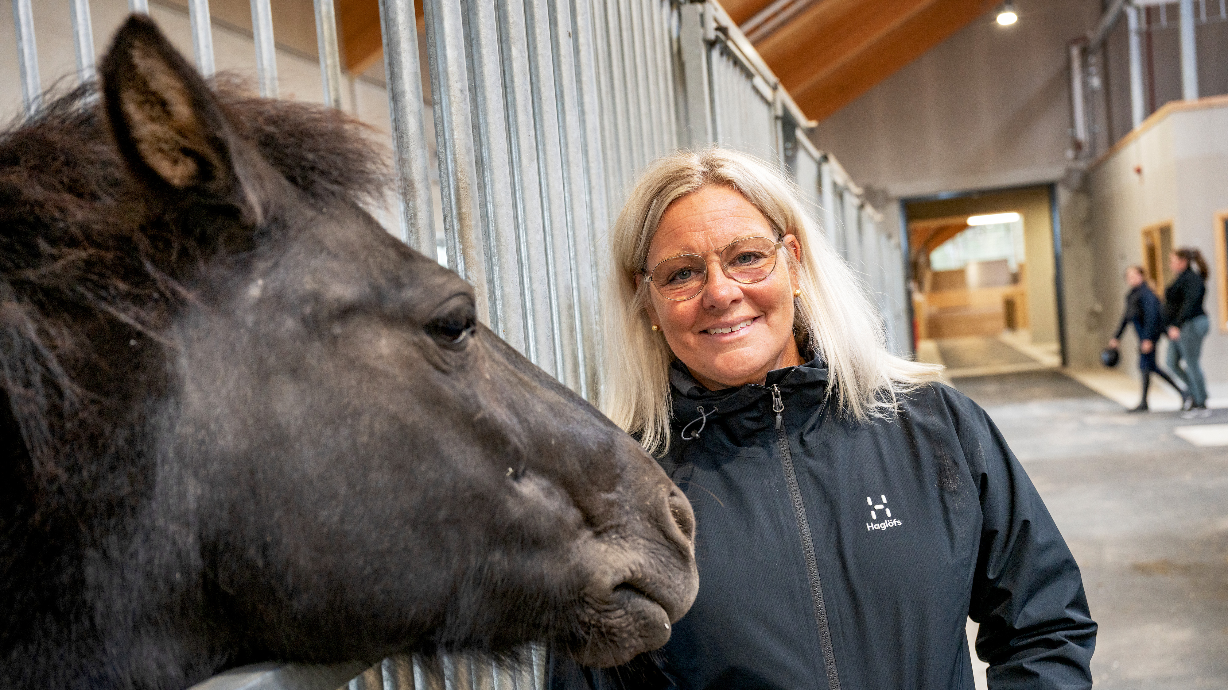 Lina Andersson tillsammans med hästen Palina Keeps ZL, i bakgrunden står stjärnhästen H&M Indiana.