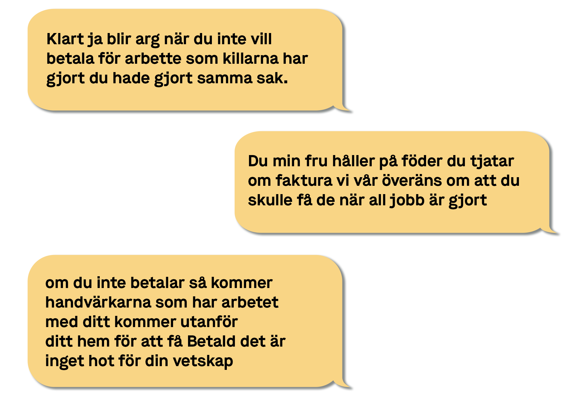 ”Okej du vill inte betala för våran jobb vi löser det på ett annat sätt tack hejdå”, skriver han till en kund som kräver en faktura, men fortsätter: ”Se till att betala för timmarna killarna har jobbat. Eller så kommer dom hem till dig så får du betala dom i kontanter.”