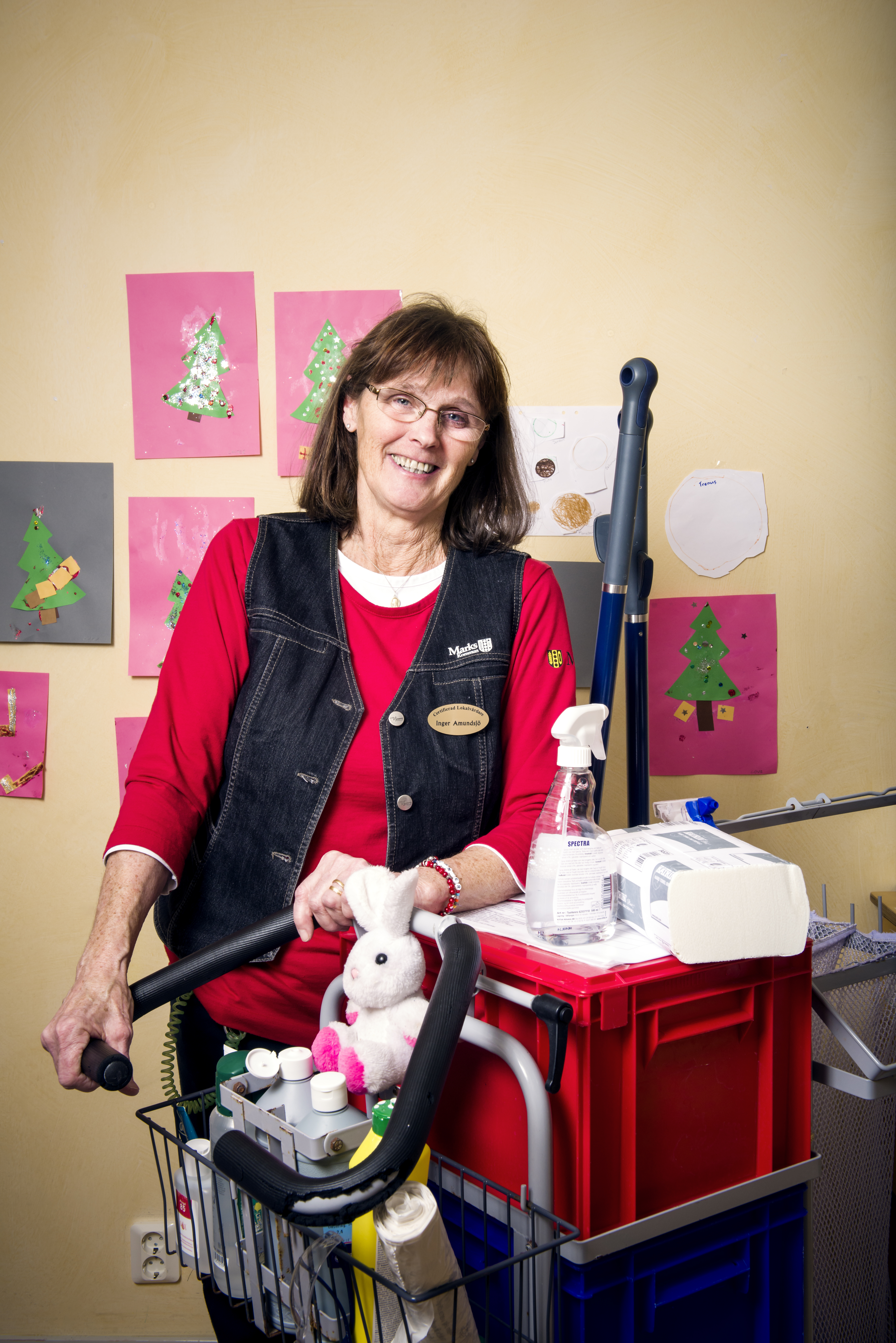 På jobbet Inger Amundsjö, 62 år och städare på Snickargårdens förskola i Kinna, berättar o…