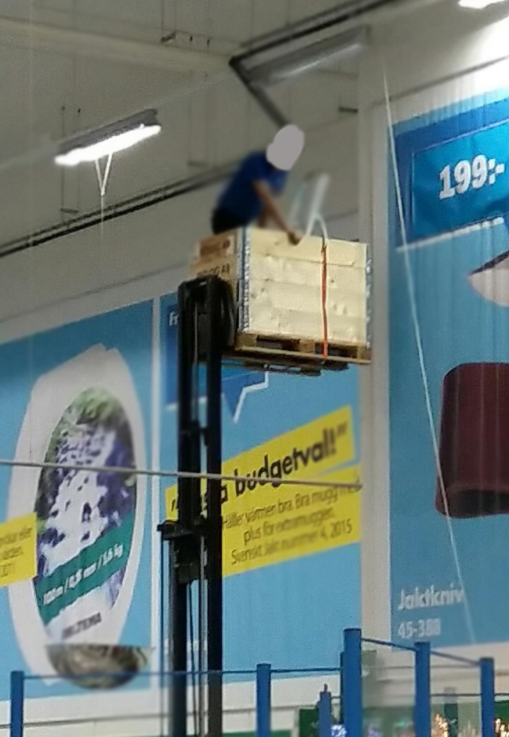 Nyheter Taklampan på Biltema i Umeå behövde bytas. Då hissades en anställd upp i en träl…