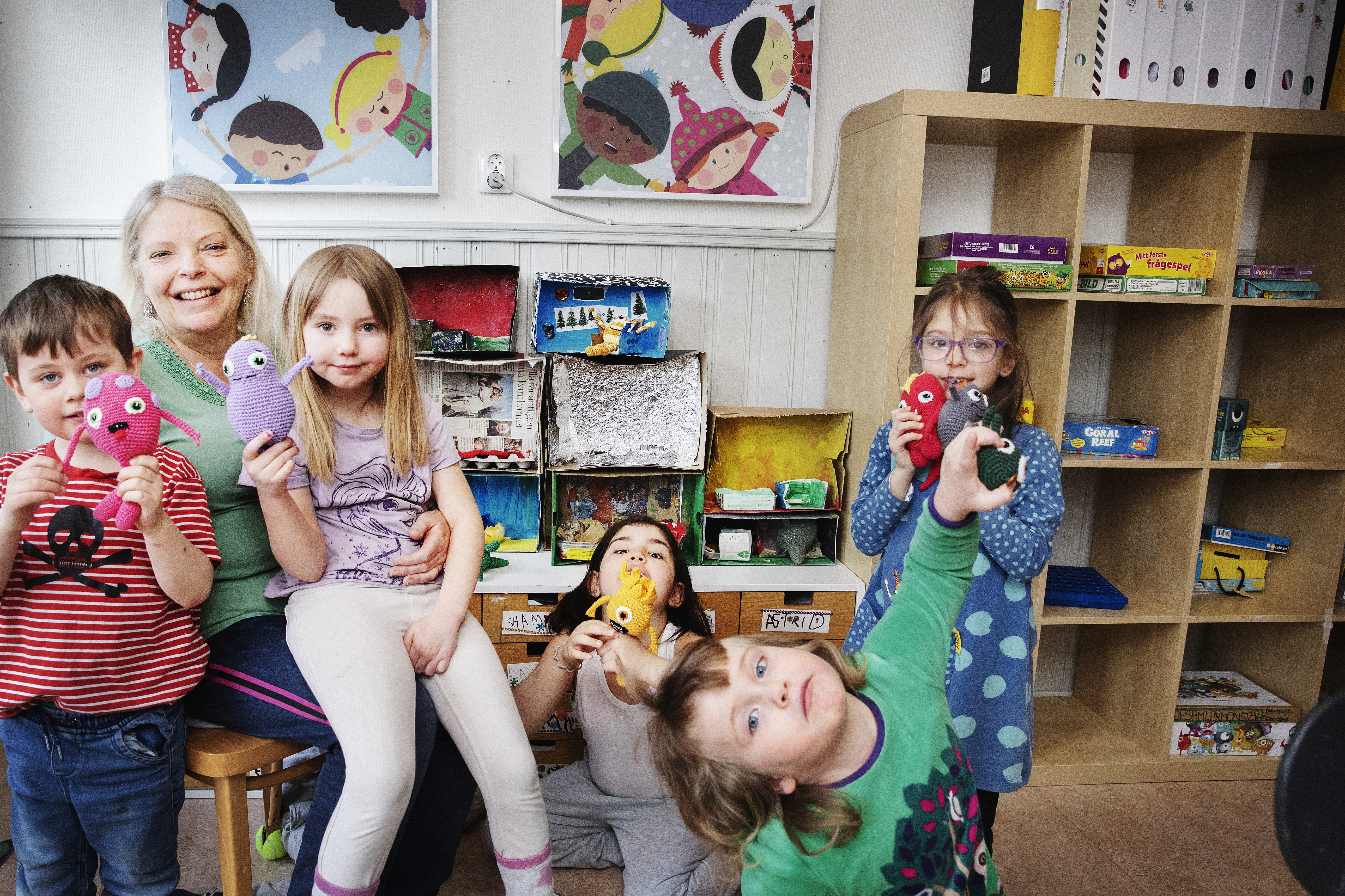 På jobbet Med hjälp av virkade sopsamlarmonster hjälper barnskötare Susanne Lundell barnen…
